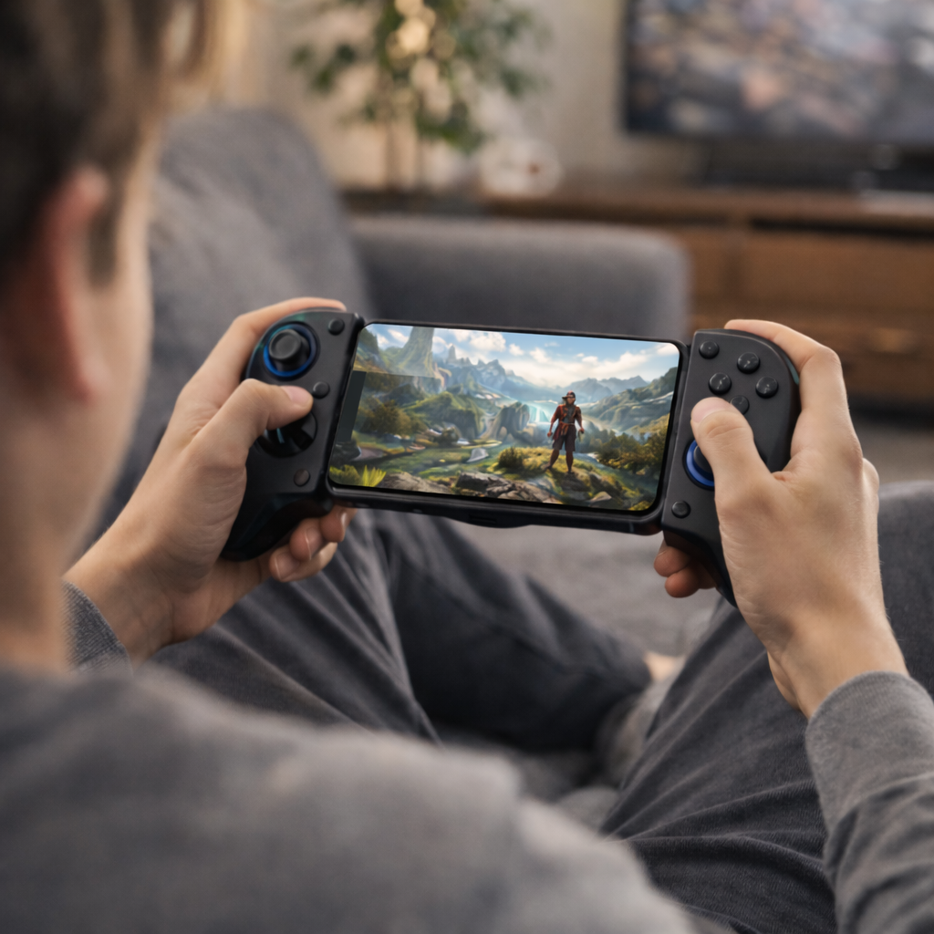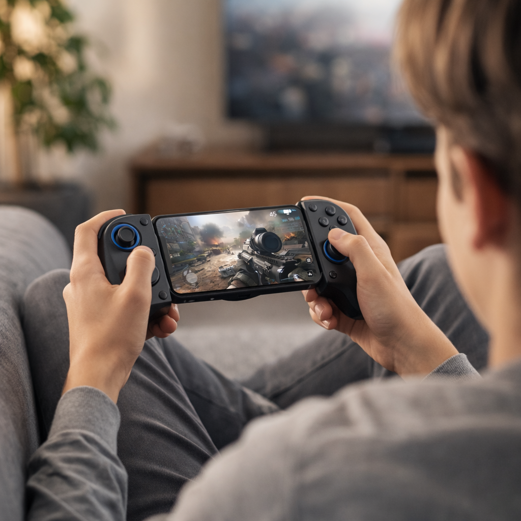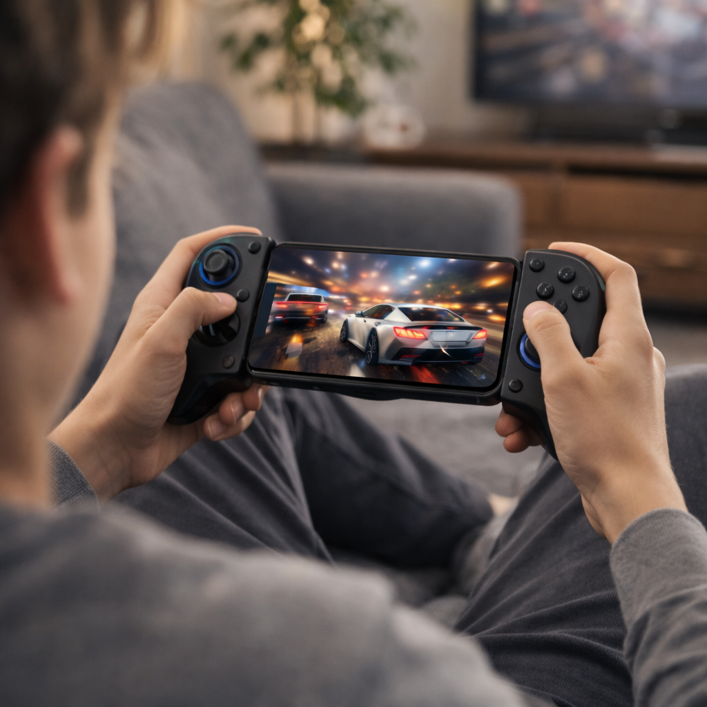 Lo uso sobre todo en el sofá y es una pasada, sobre todo con shooters y carreras. No cansa las manos y el móvil queda firme.